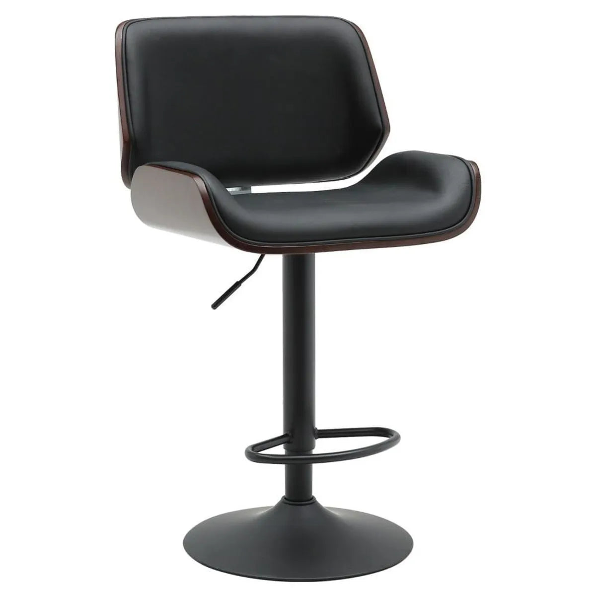 Material: Asiento y respaldo en piel sintética de alta resistencia, estructura de acero inoxidable con base tipo plato y acabado en pintura electrostática negra.