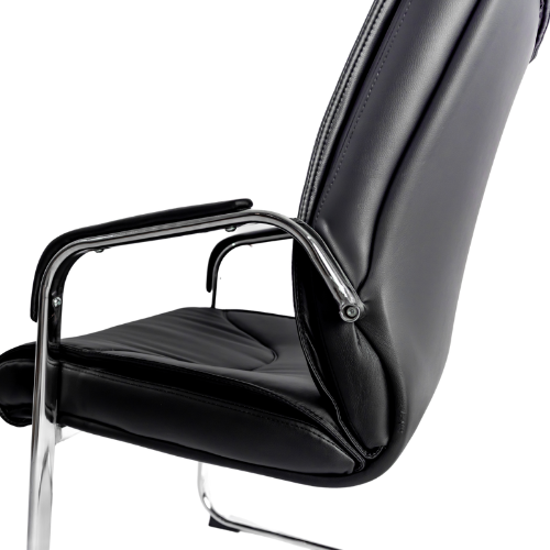 Su estructura cromada en forma de trineo brinda estabilidad y durabilidad, mientras que su asiento y respaldo tapizados en piel sintética ofrecen una comodidad superior y una fácil limpieza. El diseño anatómico con líneas curvas y costuras decorativas mejora la postura del usuario y aporta un toque sofisticado.