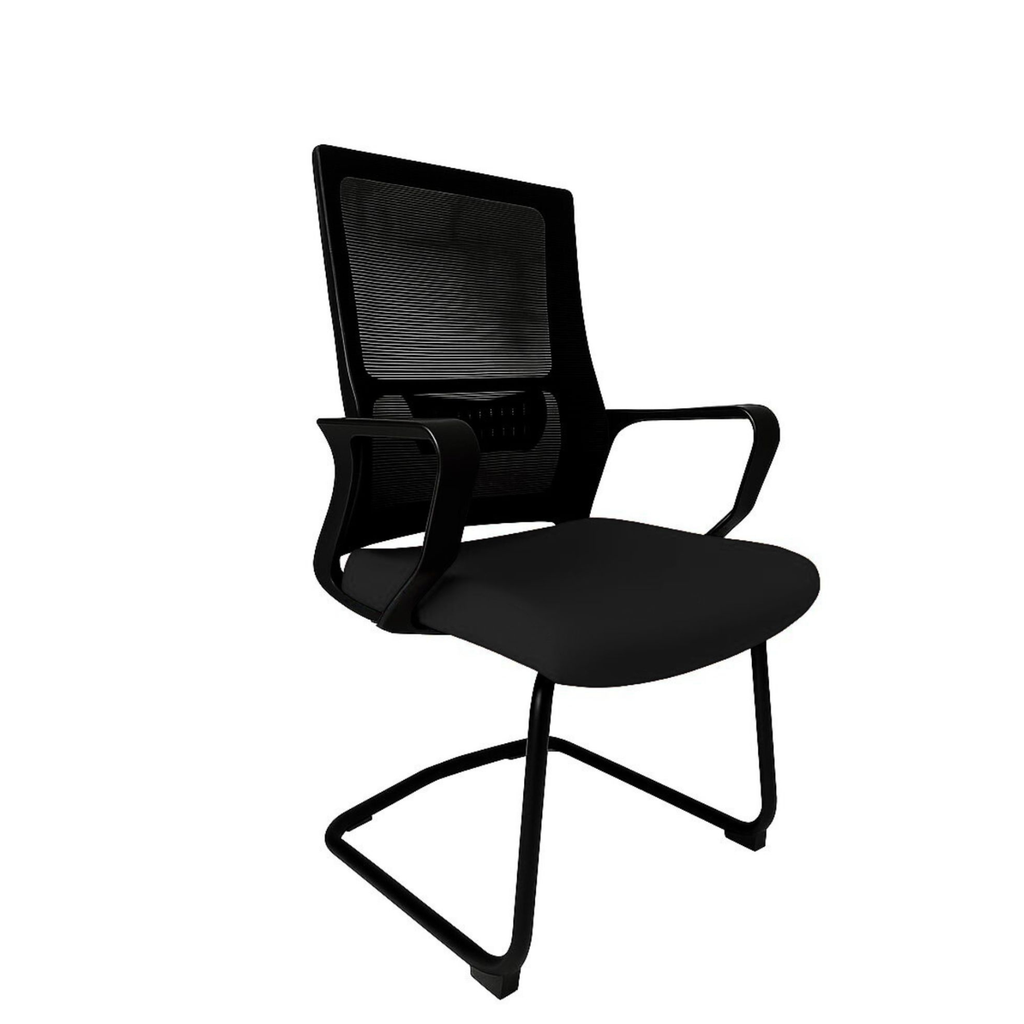 Material: respaldo con malla transpirable de alta resistencia, asiento de poliuretano inyectado suave, descansabrazos fijos en polipropileno, base tipo trineo metálica en color negro fabricada en acero de 2.0 mm de espesor.