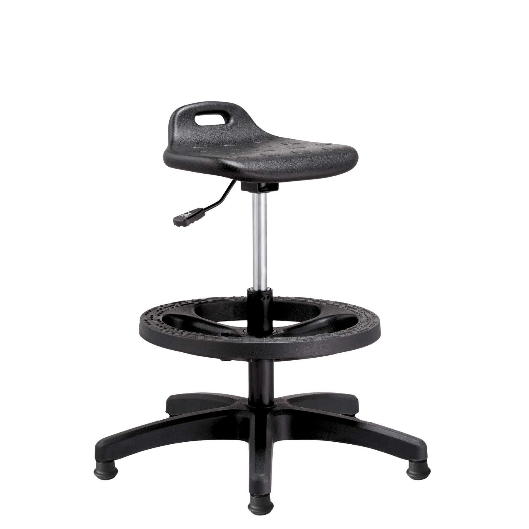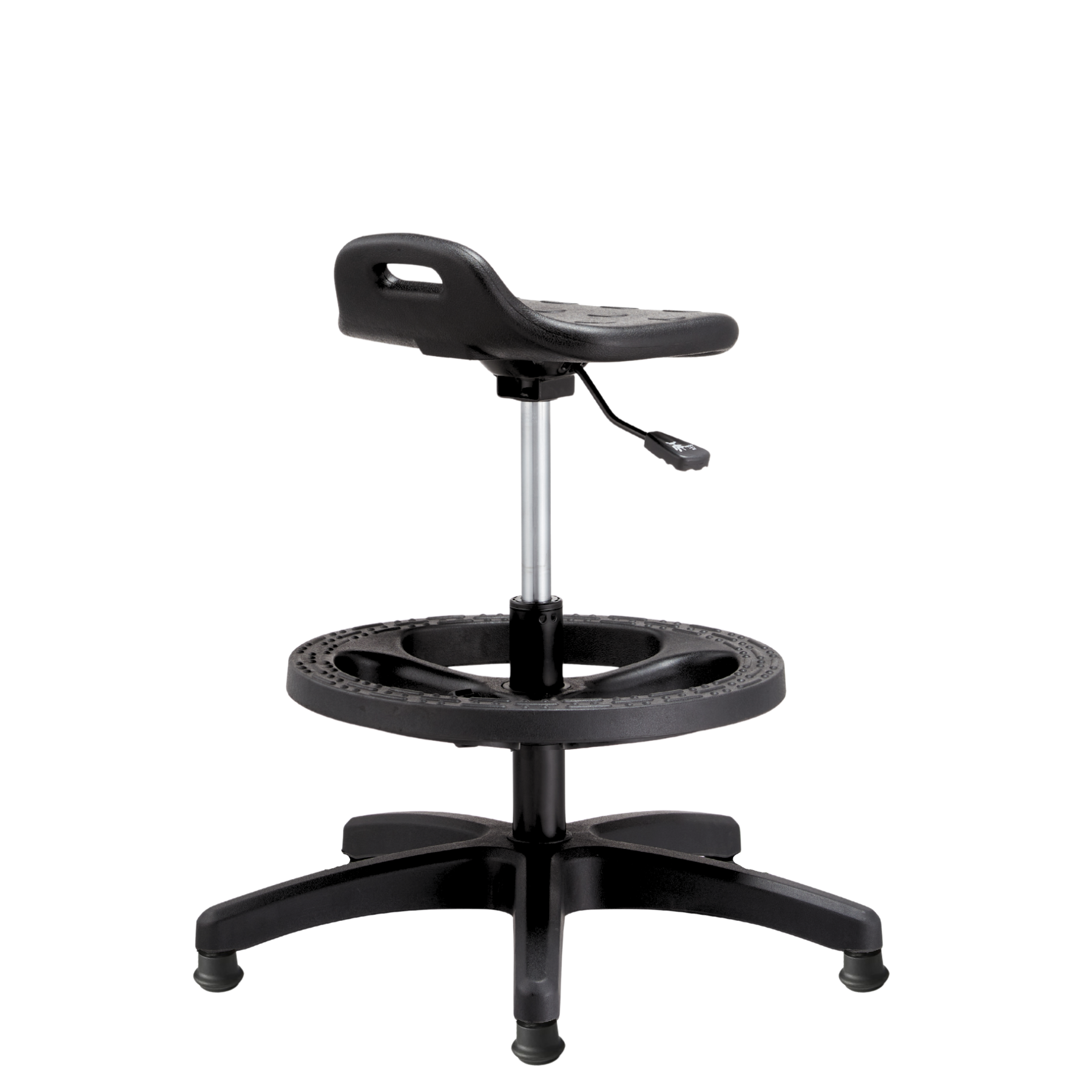 Material: asiento de goma suave; estructura con pistón tipo cajero, aro de descanso y mecanismo giratorio.