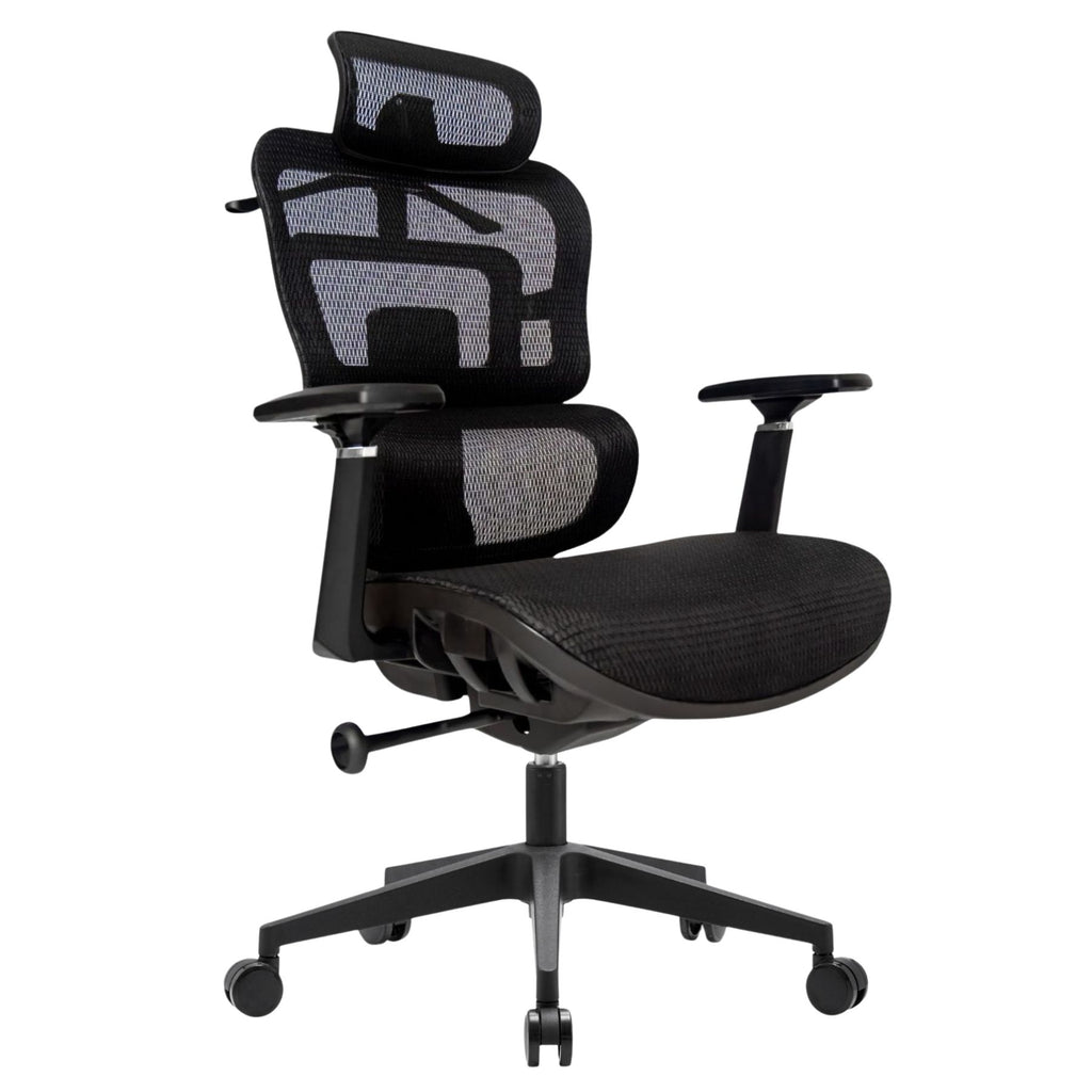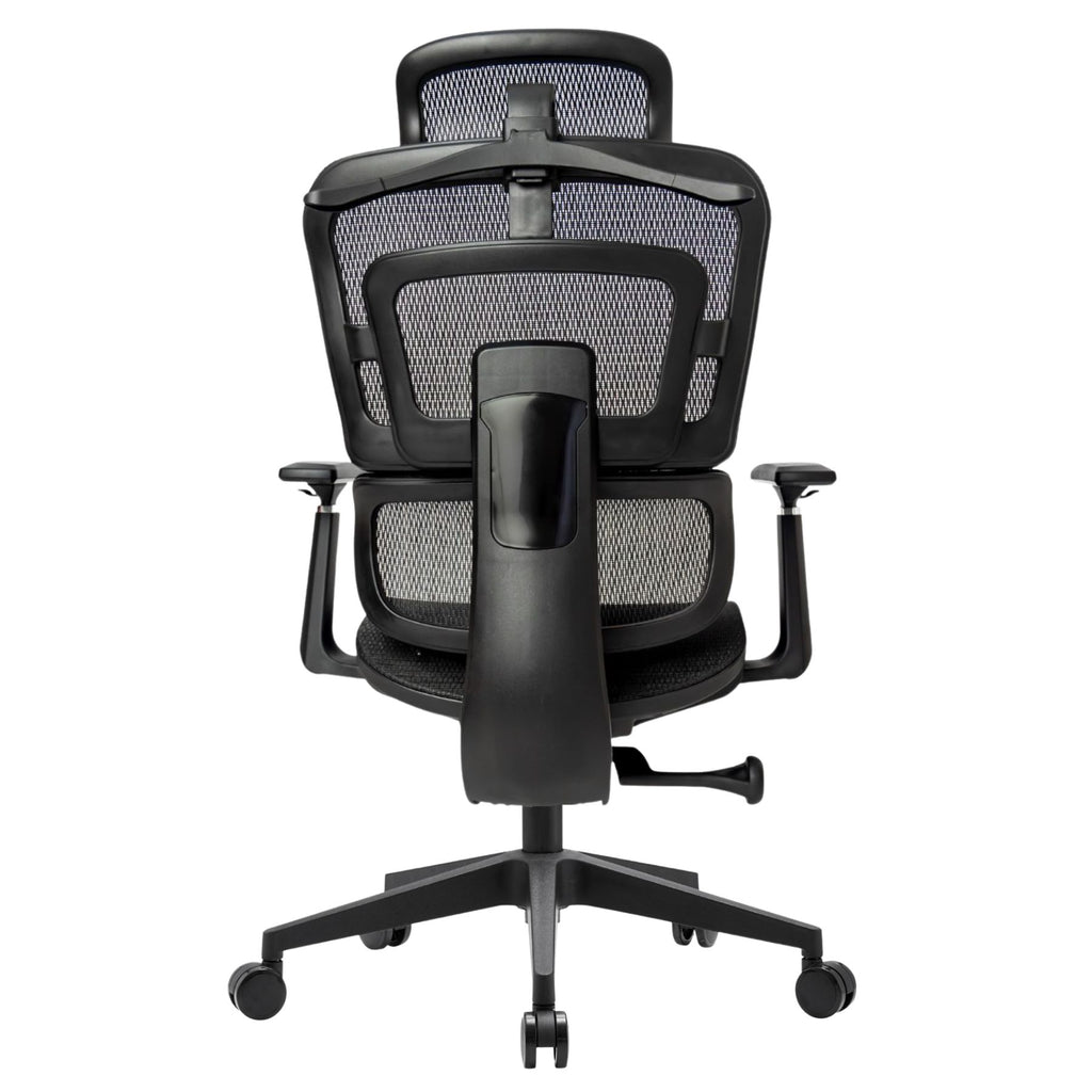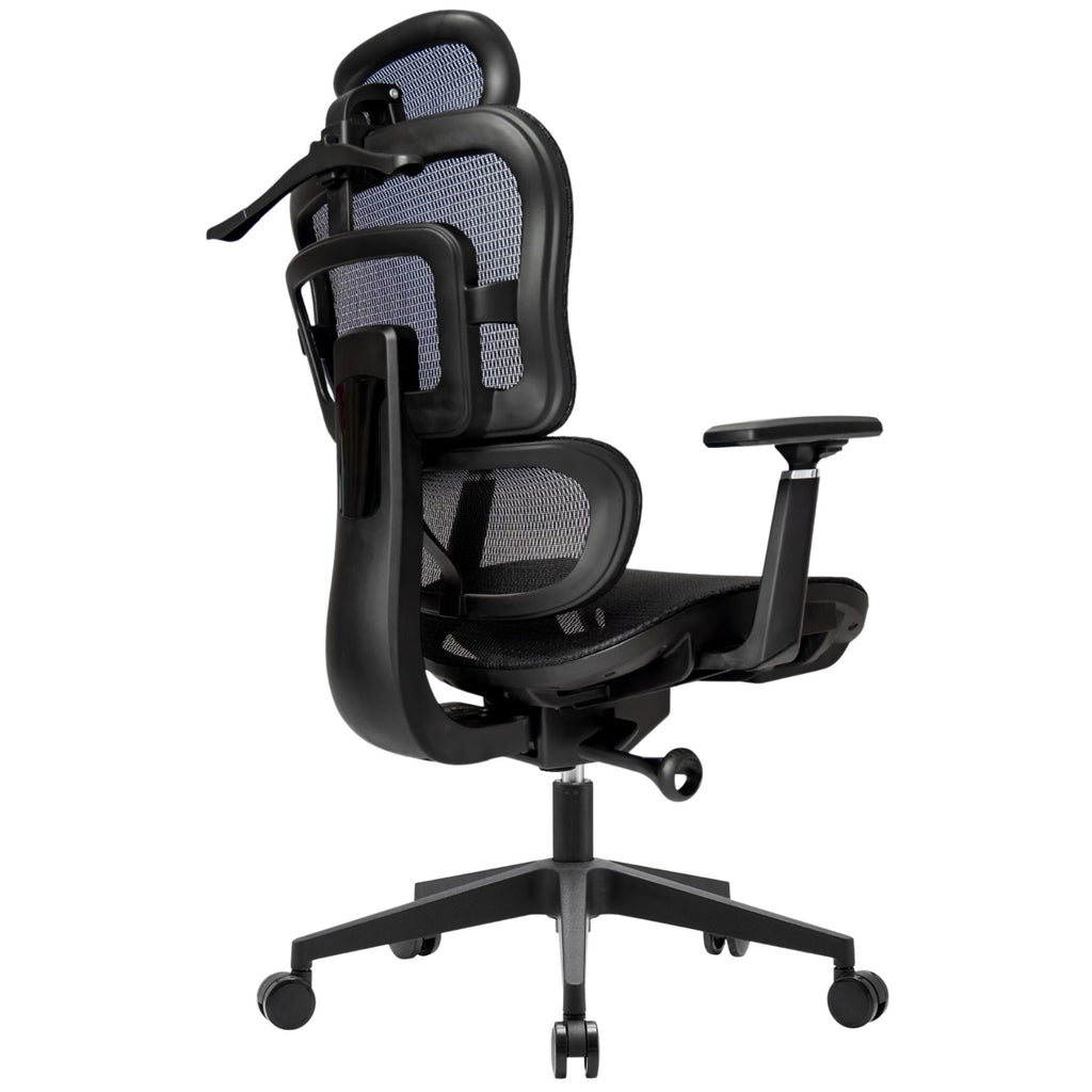 Material: respaldo con malla transpirable y soporte lumbar ajustable en altura, cabecera ergonómica ajustable, brazos ajustables 3D con pad suave, asiento de poliuretano inyectado de 10 cm con tapiz y costura, base giratoria cromada fabricada en acero de alta resistencia, con mecanismo basculante de una posición y ajuste neumático de altura.