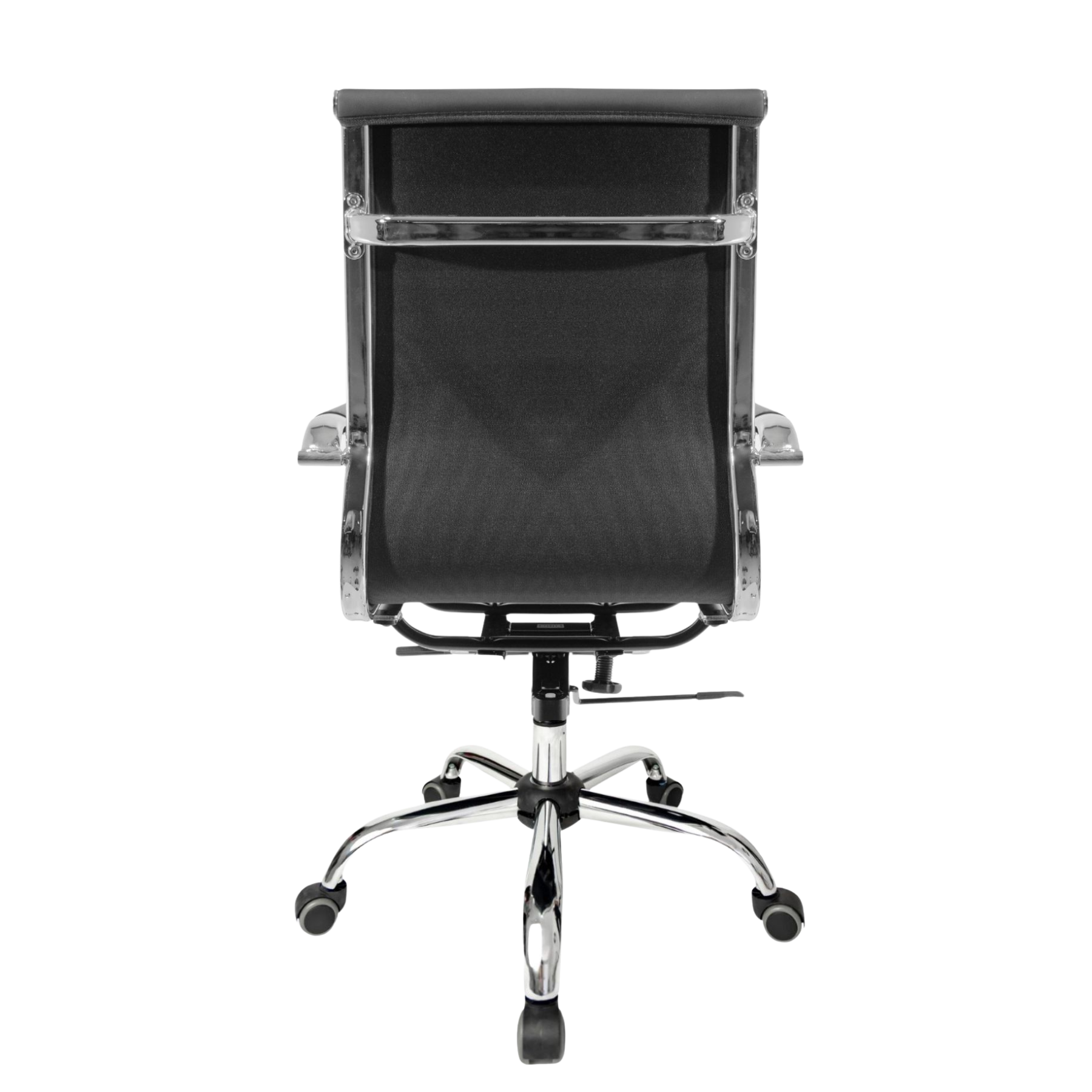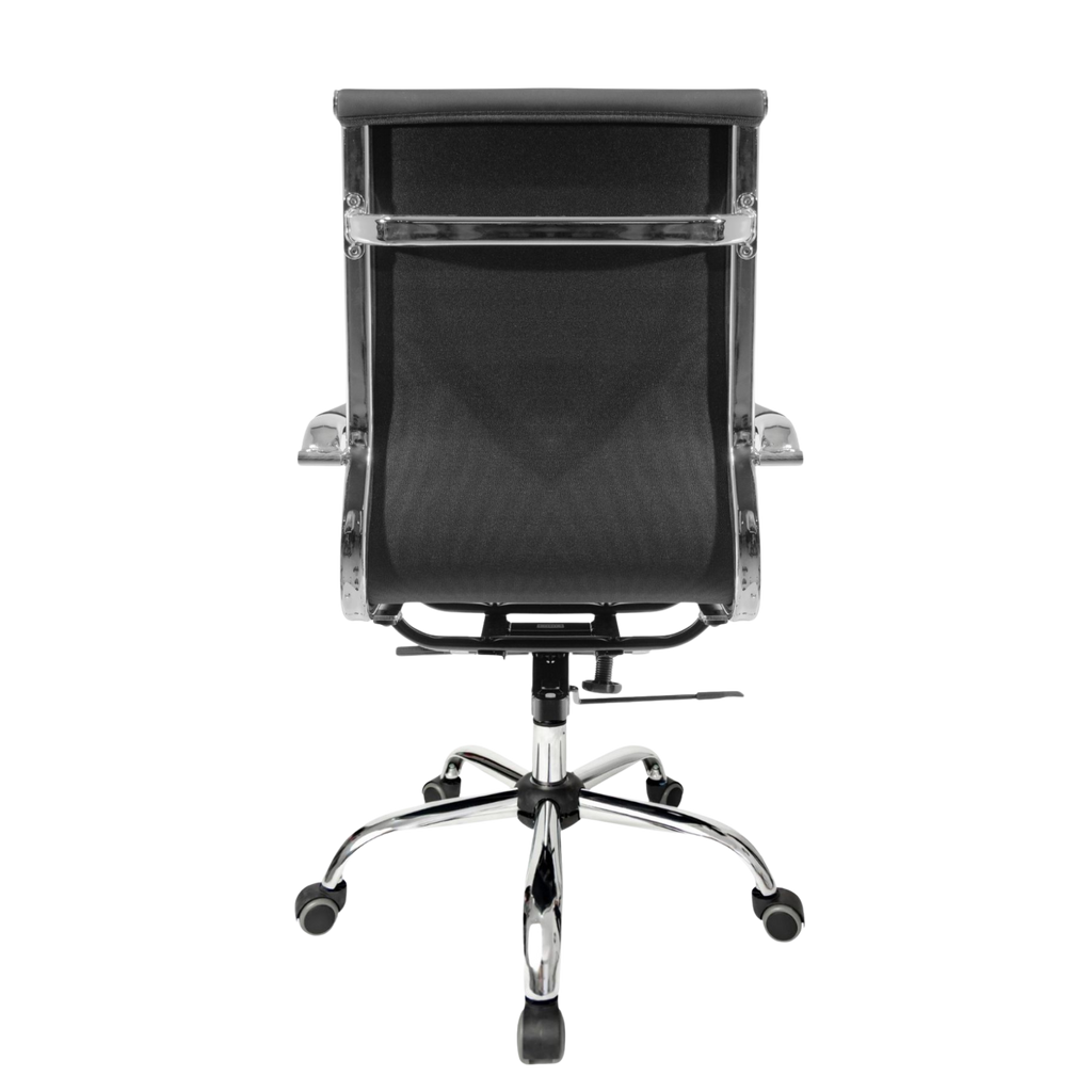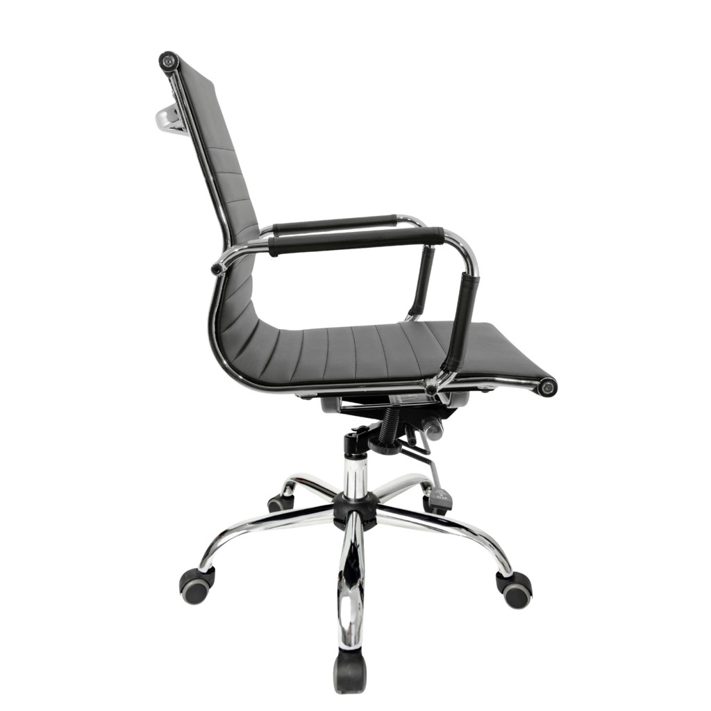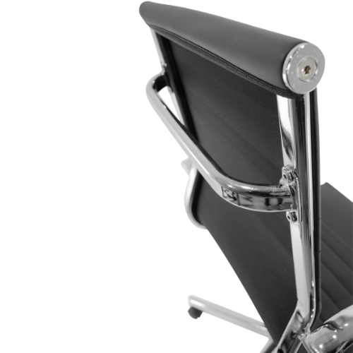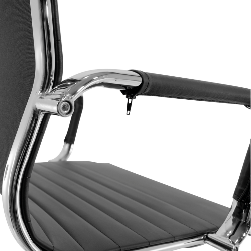 Su estructura metálica cromada ofrece gran resistencia y estabilidad, mientras que el asiento y respaldo tapizados en piel sintética proporcionan confort y un mantenimiento sencillo. Las costuras horizontales aportan un detalle decorativo que refuerza su aspecto ejecutivo.
