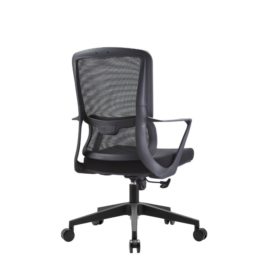 Material: asiento con hule espuma de alta densidad tapizado en tela, respaldo de malla transpirable con soporte lumbar integrado, descansabrazos fijos de polipropileno, base de nylon con rodajas y pistón neumático para ajuste de altura.