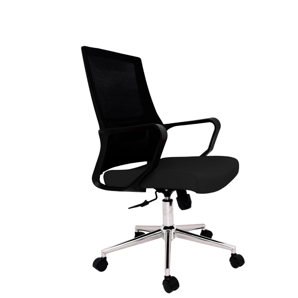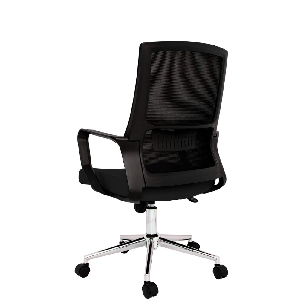 Material: respaldo con malla transpirable de alta resistencia y soporte lumbar fijo, asiento de poliuretano inyectado suave tapizado en tela, descansabrazos fijos de polipropileno y base giratoria cromada de acero de alta resistencia con mecanismo reclinable y ajuste neumático de altura.